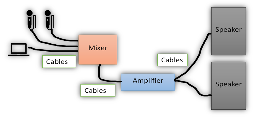 As we can see, there are FIVE main components in the PA system and those are speakers, amplifiers, mixing consoles, audio sources, and audio cables. Let us hop in to understand more of them.