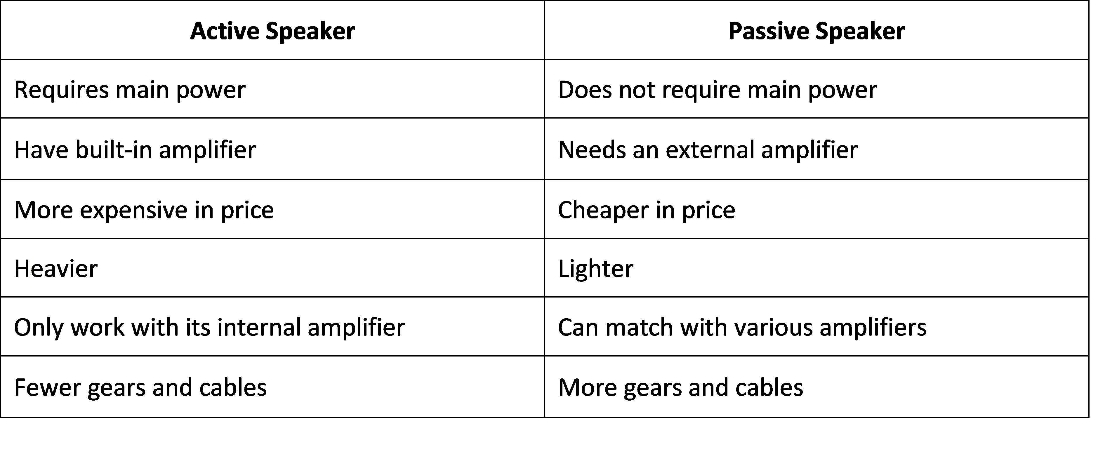 One of the main differences between active and passive speakers are that active speakers have built-in amplifiers while passive speaker does not have a built-in amplifier inside of it, so it needs an external amplifier to connect to.